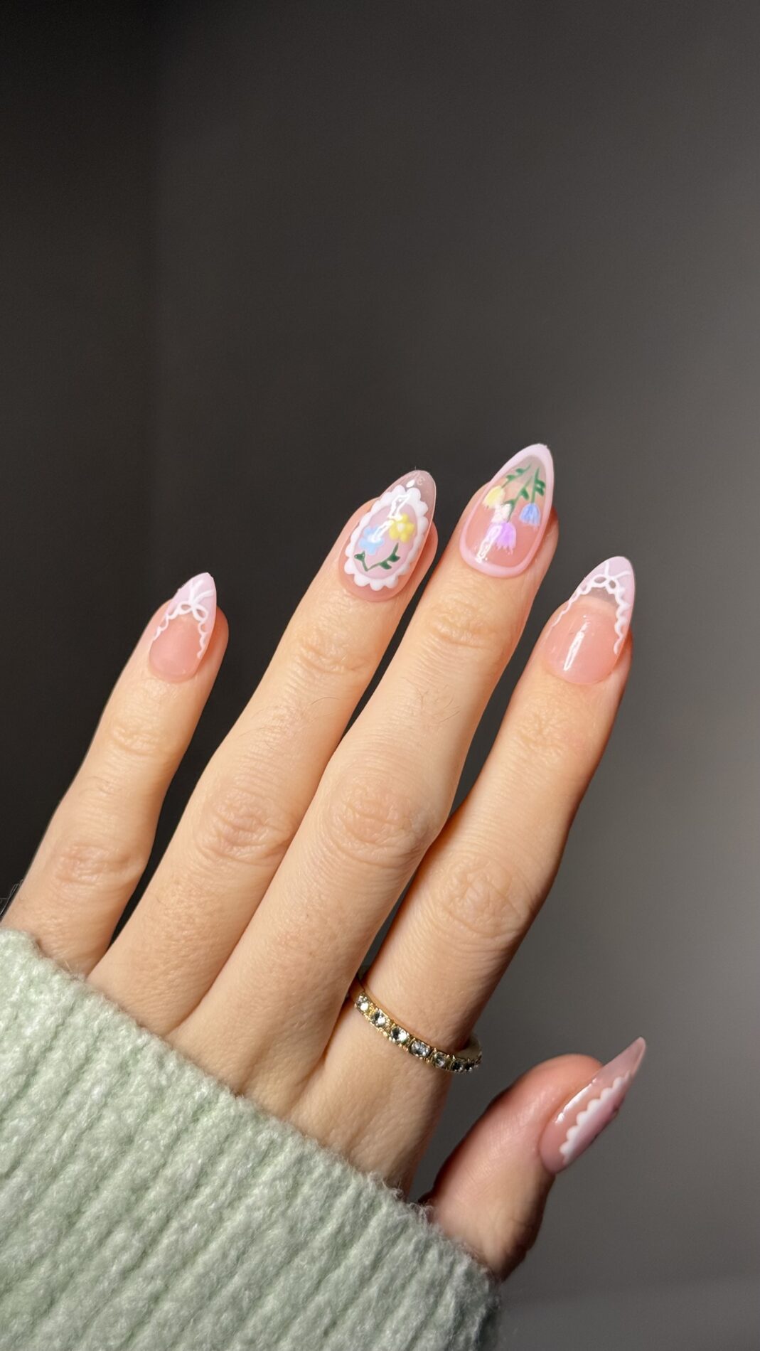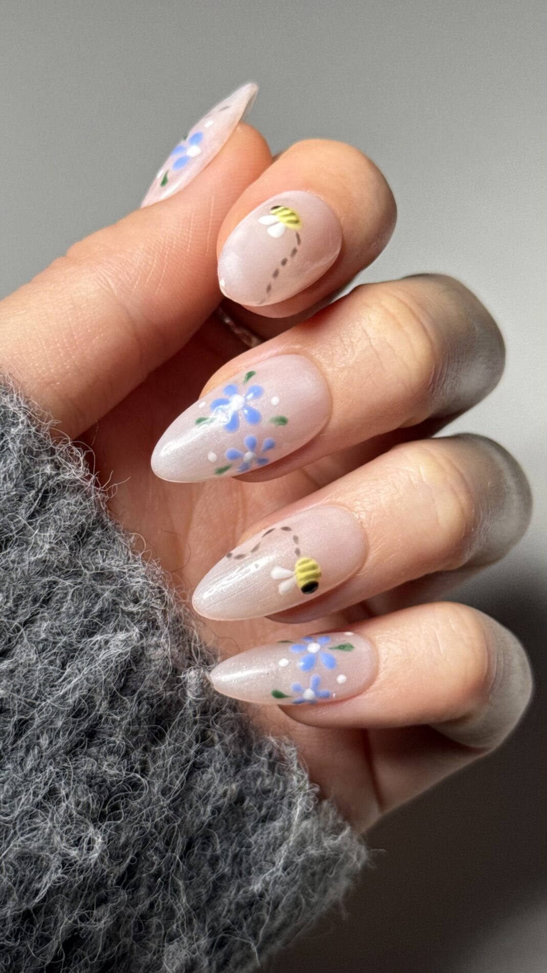 Small hand-painted daisies, tulips or blossoms on a neutral base bring a soft, nature-inspired feel to spring manicures.