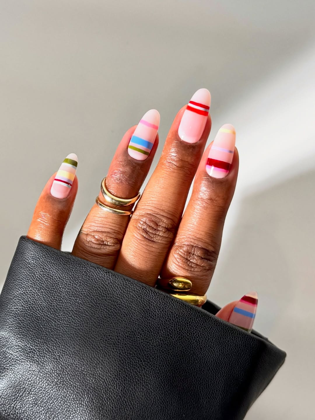 Fine stripes in pastel or neutral tones create a simple but striking design that works beautifully on shorter nails.
